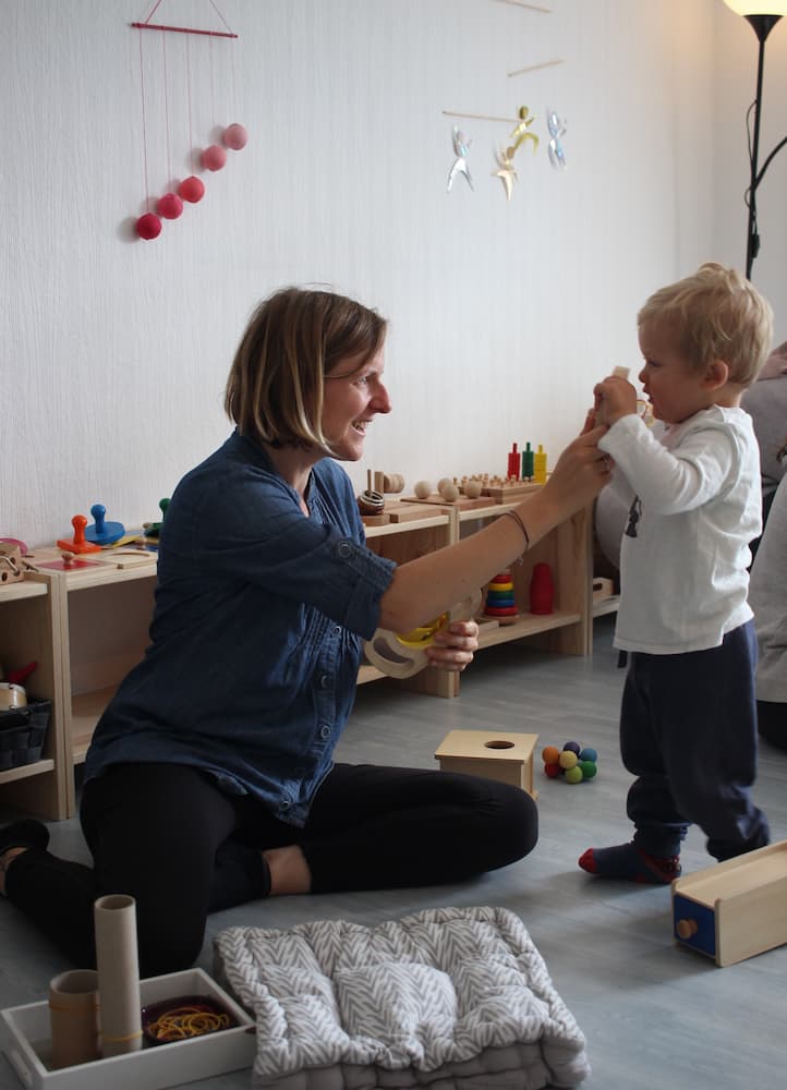 L’éducatrice Montessori accueillante observe chaque enfant et lui propose des activités adaptées à ses besoins et intérêts. L’environnement préparé selon les principes de la pédagogie Montessori et de la motricité libre offre aux enfants un espace d’éveil sensoriel, de langage, des jeux de motricité fine et des activités de vie pratique.