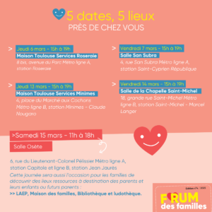 Vous êtes parent ou futur parent et vous êtes à la recherche d'un mode d'accueil pour votre enfant ? Rendez-vous au forum des familles, organisé par la Mairie de Toulouse en partenariat avec la Caf ! Du 6 au 15 mars, des professionnels de la petite enfance répondront à toutes vos questions, quels que soient vos besoins ou votre situation.