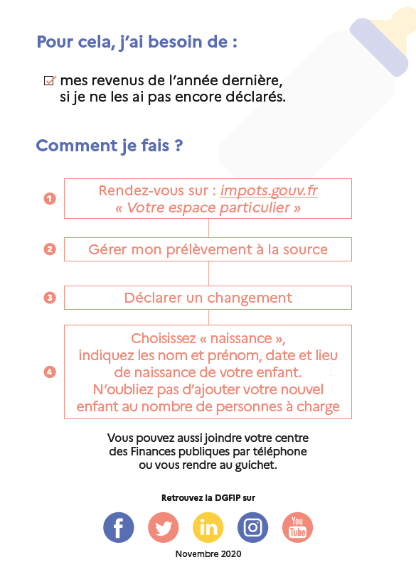 Adoptez le bon réflexe ! En tant que jeunes parents, il est important de signaler votre changement de situation familiale sur www.caf.fr, mais aussi d’adapter votre taux de prélèvement à la source sur le site impots.gouv.fr. Ce signalement permet d’adapter votre taux et vos éventuels acomptes en prenant en considération la nouvelle composition du foyer fiscal.