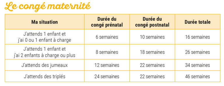Le congé maternité : la durée du congé prénatal (avant la date présumée d’accouchement) et postnatal (après l’accouchement) dépend du nombre d’enfants à naître et du nombre d’enfants déjà à charge. Elle varie de 16 à 46 semaines. Pendant le congé maternité, des indemnités journalières sont versées par la Caisse d’assurance maladie sous certaines conditions. Un simulateur est mis à disposition sur Ameli.fr pour estimer facilement ses indemnités journalières.